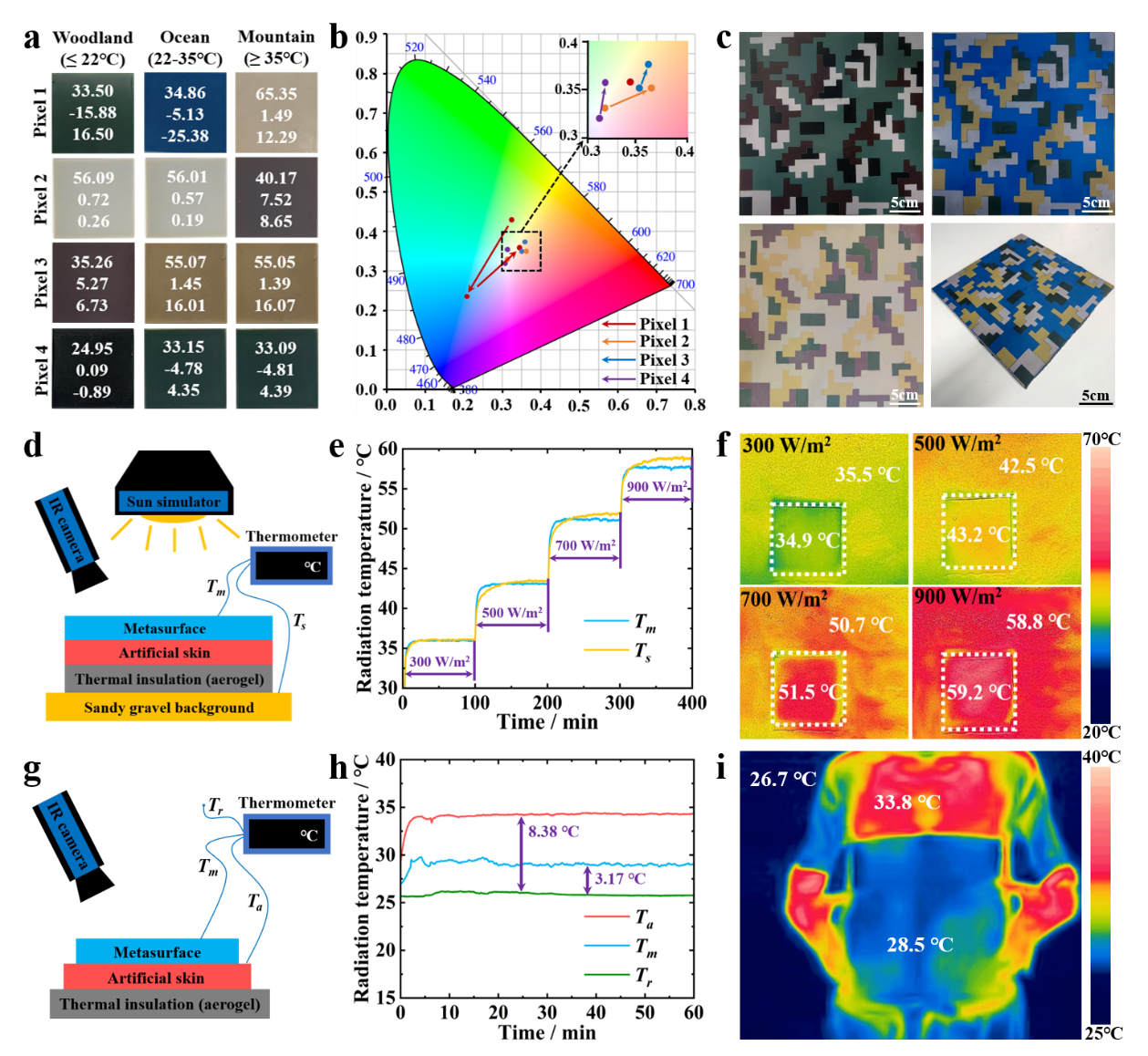 图2. 超表面的可见光和红外伪装特性表征。a) 在林地、海洋和山地三种状态下测量的四个像素的光学图像及其嵌入的CIE Lab值。b) 四个像素在 CIE 色彩空间中的色度变化和空间分布。c) 三种状态下伪装像素层(30cm × 30cm)的光学图像,以及超表面的宏观视图。d) 用于演示热补偿性能的实验装置。e) 不同输入功率下测量的超表面/砾石地面温度 Tm/Ts。f) 不同输入功率下超表面和砾石地面的红外图像。g) 用于演示热屏蔽性能的实验装置。h) 室温下测量的超表面/人造皮肤温度 Tm/Ta。i) 超表面与人体皮肤接触 20分钟后的红外图像。