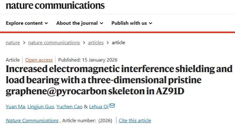 博士生马媛为第一作者的文章《Increased electromagnetic interference shielding and load bearing with a three-dimensional pristine graphene@pyrocarbon skeleton in AZ91D》在Nature子刊《Nature Communications》上发表。该文报道了团队在石墨烯增强镁基复合材料电磁屏蔽-力学性能研究方面取得的新进展。